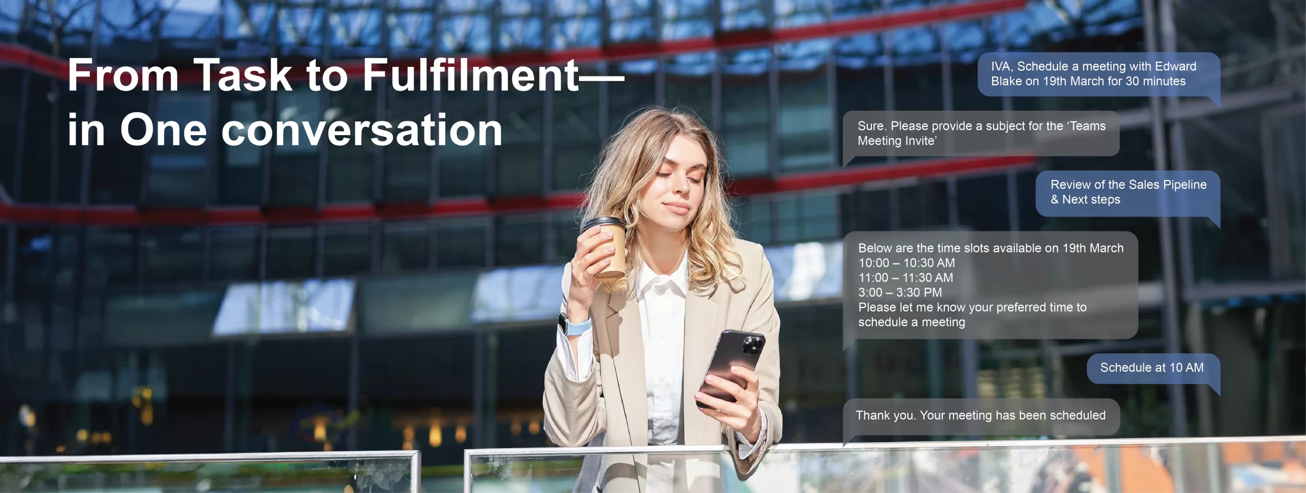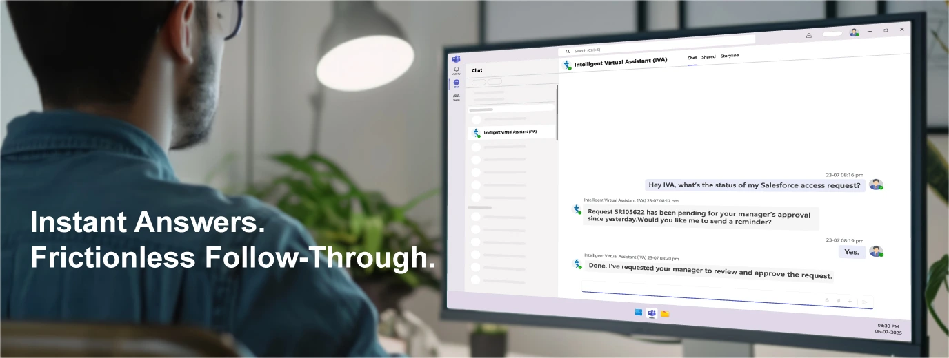 Let our Intelligent Virtual Assistant (IVA) take care of the repetitive work. From handling routine tasks to simplifying everyday interactions, it enables users to focus on what truly matters—driving innovation and business value. The result: accelerated outcomes, elevated user productivity, and a more intelligent, experience-driven way to work.