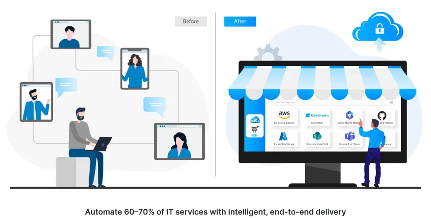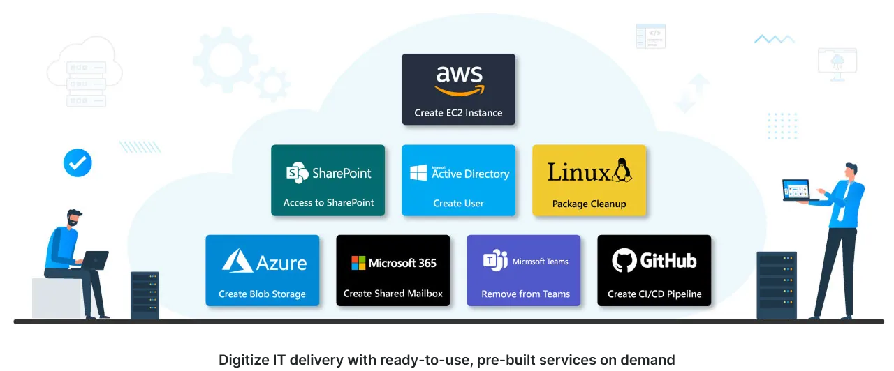 Just as consumer experiences have been transformed by on-demand apps, this model brings the consumerization of IT to the enterprise. Much like browsing Amazon, admins can explore a broad catalog of services, subscribe at a click, and make services instantly available to users. This eliminates the cost, complexity, and delays of custom builds, replacing them with a flexible, plug-and-play system that scales as fast as business demands.